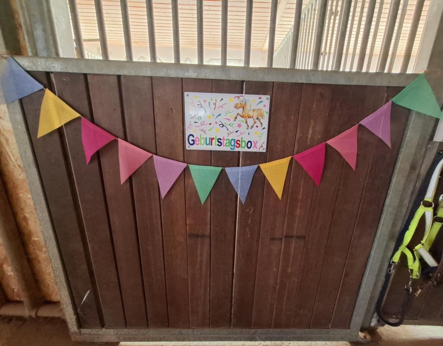 Es folgt eine Kuchenpause in unserer geschmückten Geburtstags-Pferdebox. (Papp-)Geschirr, Becher, Getränke und Kuchen o.ä. sollte von Ihnen mitgebracht werden.
