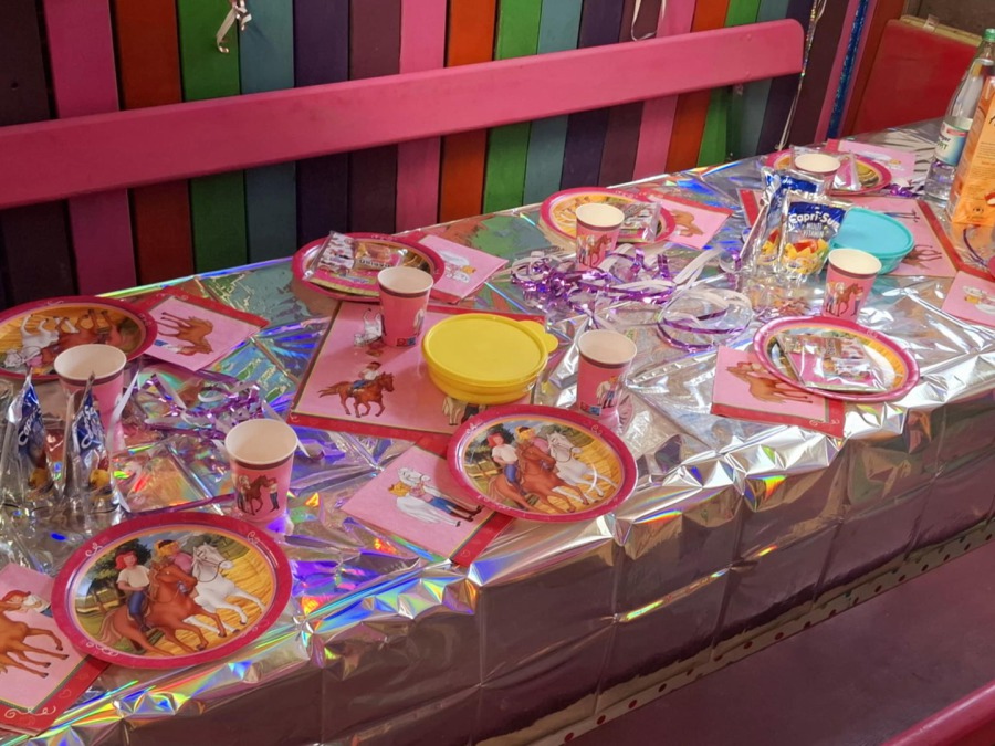Unsere schöne "Villa Kunterbunt Geburtstagsbox" kann hierfür individuell dekoriert und eingedeckt werden - dort wird auch gegessen und gebastelt.