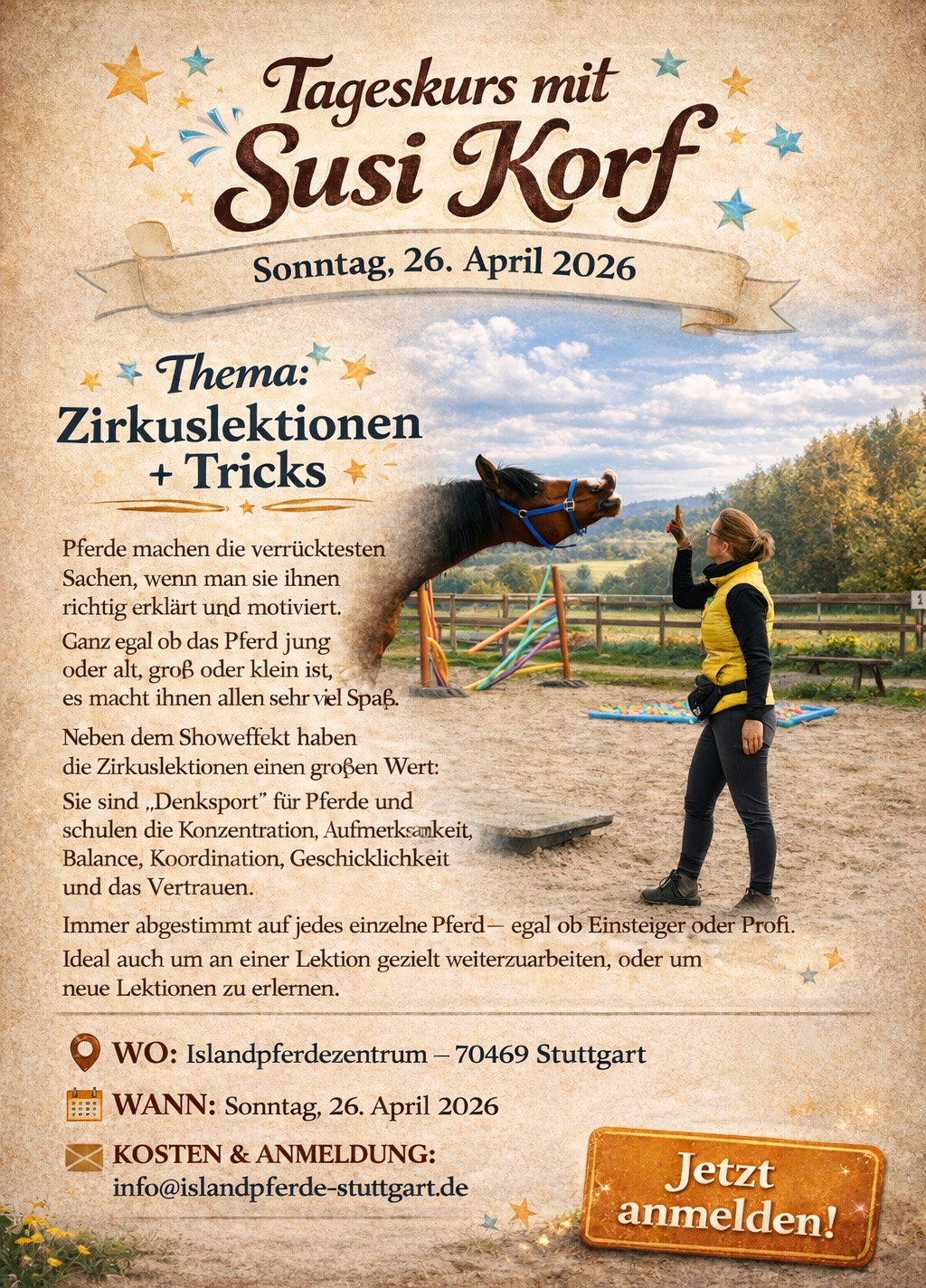 26.04.: Zirkuslektionenkurs mit Susi Korf (Islandpferdez./Stuttgart) mehr Infos
